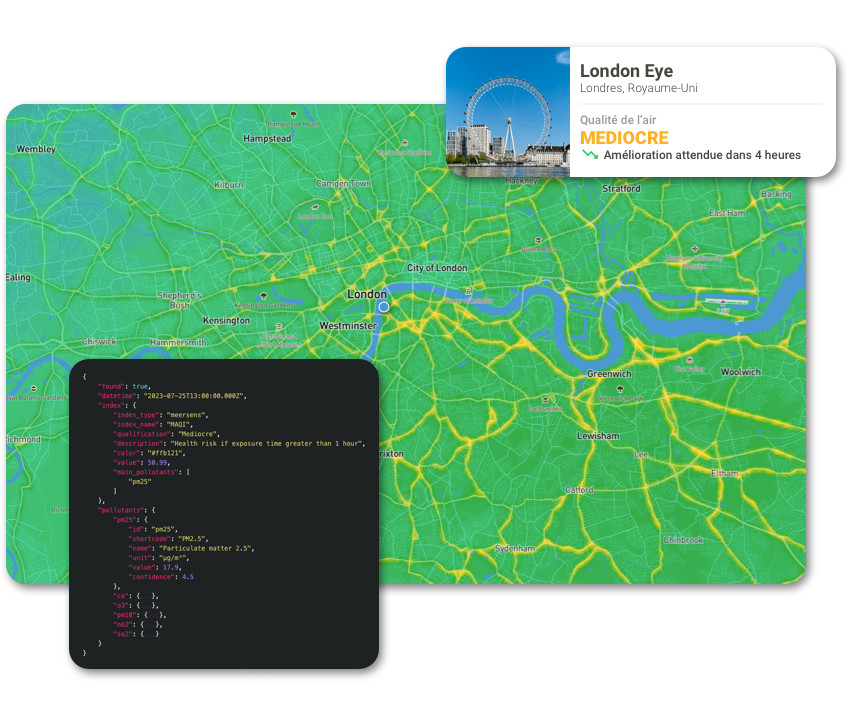 Exploitez tout le potentiel de vos données sur l’environnement et la pollution grâce à notre plateforme API de pointe. Exploitez sans effort des données provenant de diverses sources et périodes, et obtenez des informations en temps réel qui facilitent la prise de décisions intelligentes et une meilleure prise de conscience environnementale. Notre API permet à votre entreprise d’améliorer ses opérations, de minimiser la pollution, d’optimiser l’affectation des ressources et de respecter les réglementations environnementales en toute transparence. Profitez du pouvoir de transformation de l’intelligence environnementale et positionnez votre entreprise à la pointe de l’innovation !