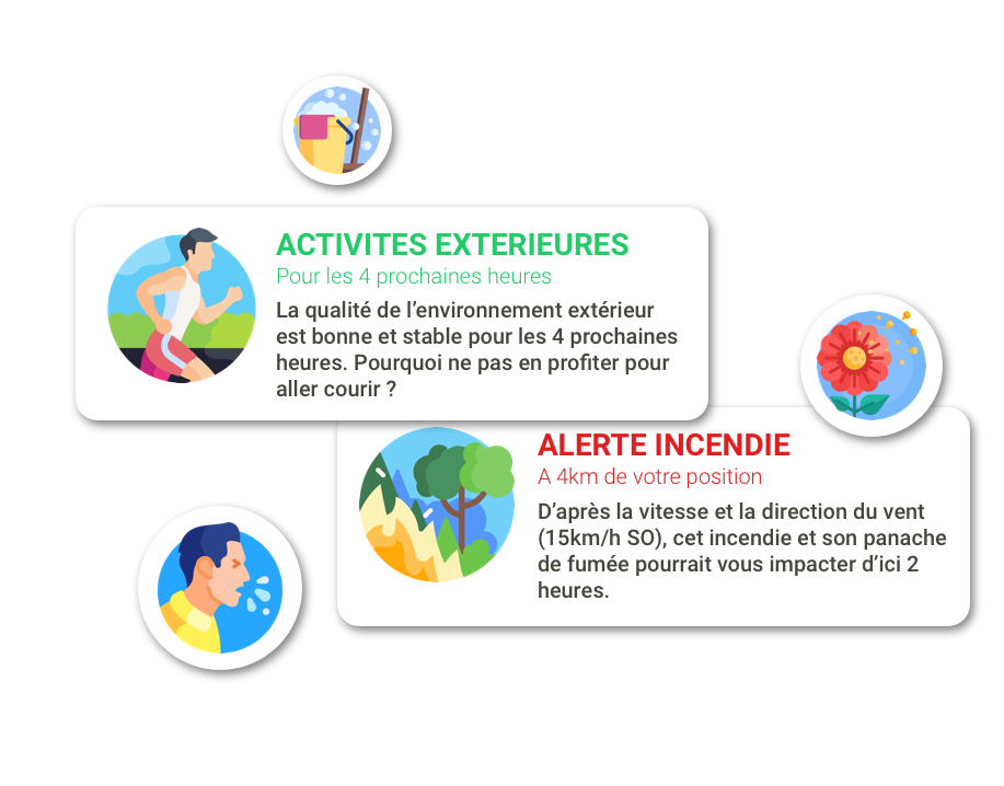 Les indices sont fournis par des organismes de santé (Agence européenne de l’environnement pour EAQI, Associations de surveillance de la qualité de l’air pour ATMO) ou ont été créés par Meersens pour MAQI. En fonction de la valeur retournée par la modélisation à un instant donné, l’indice attribue un indicateur de qualité de l’environnement (bon, modéré, mauvais, …), ainsi que les risques associés et les recommandations comportementales. L’indice MAQI de Meersens prend en compte les normes de l’OMS et précise la durée d’exposition avant qu’elle ne présente un risque pour la santé.