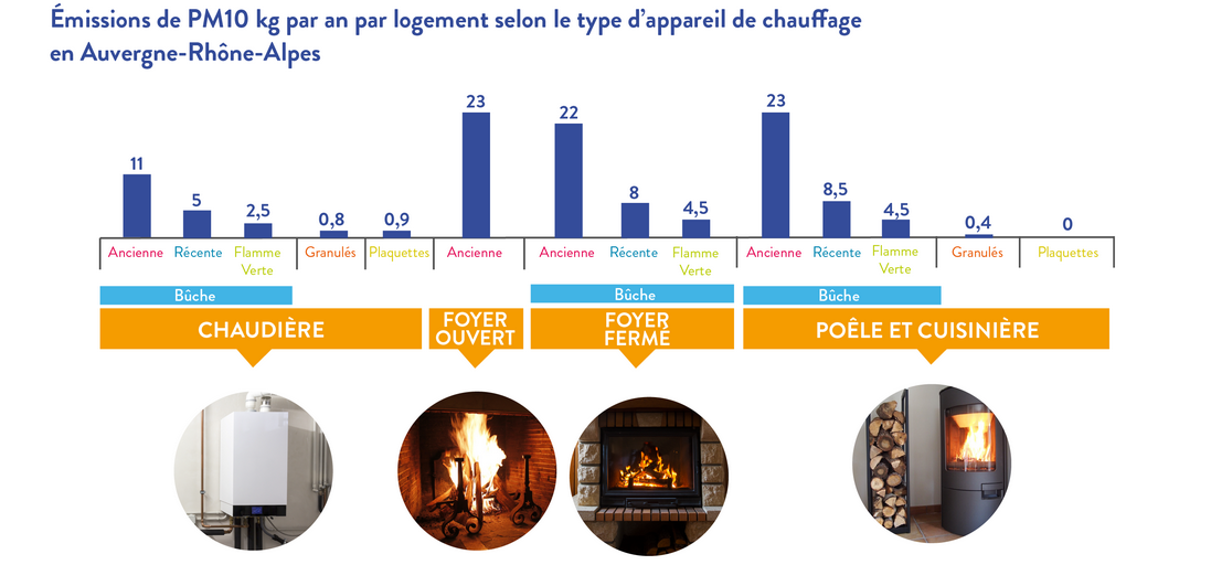 Le chauffage au bois considéré comme non performant, tel que les cheminées ouvertes, poêles anciens, appareils datant d’avant 2002, est une source majoritaire de particules.