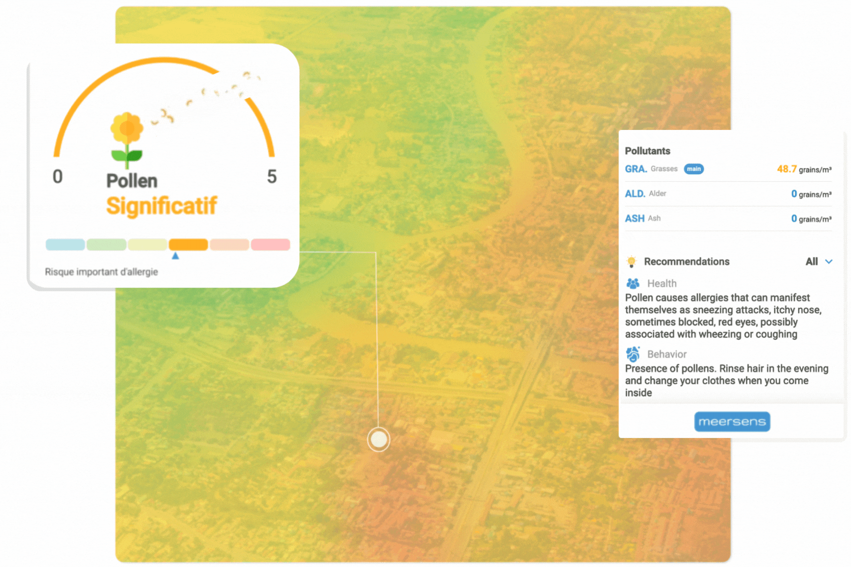 Meersens models pollen distribution by combining satellite imagery with exclusive models to predict and forecast pollen levels from trees, grasses, and weeds. The models are based on weather conditions (precipitation, humidity, temperature) and on seasonality, which depends on the pollen species and location. This data is also combined with high-resolution vegetation distribution data to accurately assess pollen presence at a city-wide scale and to better prevent allergy risks. Since vegetation is heavily influenced by the modeled geographic area, the models are location-based, and Meersens produces very comprehensive inventories of the plant species involved in each area.