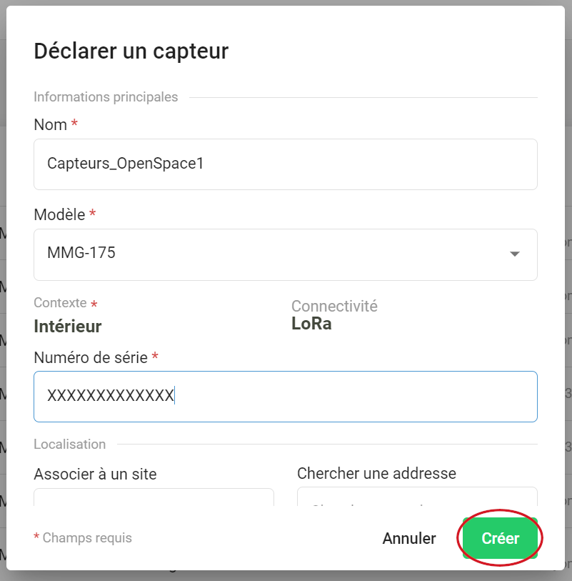 - Ajoutez la localisation du capteur puis appuyez sur le bouton « Déclarer le nouveau capteur ».