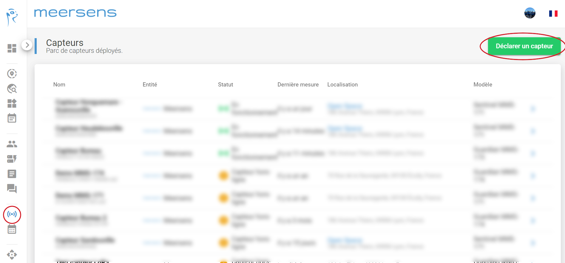 - Étape 3 : Vérifiez que le(s) capteur(s) MMG-175 soient déclarés dans la plateforme Meersens.
