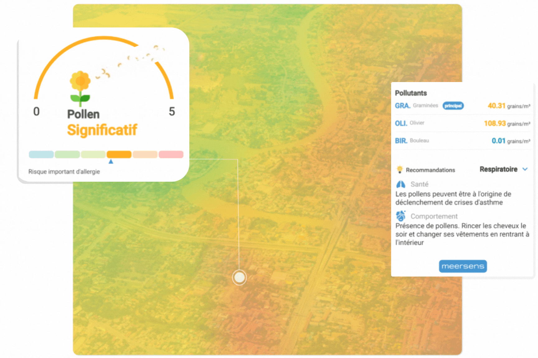 Meersens modélise la distribution des pollens en combinant l’imagerie satellitaire et des modèles exclusifs pour prédire et prévoir les niveaux de pollens d’arbres, de graminées et de mauvaises herbes. Les modèles sont basés sur les conditions météorologiques (précipitations, humidité, température) et sur la saisonnalité qui dépend de l’espèce de pollen et du lieu. Ces données sont également combinées à des données de distribution de la végétation à haute résolution afin d’évaluer avec précision la présence de pollen à l’échelle d’une ville et de prévenir au mieux les risques d’allergie. Comme la végétation dépend fortement de la zone géographique modélisée, les modèles sont basés sur la localisation et Meersens produit des inventaires très complets des espèces végétales impliquées dans chaque zone.